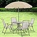[Elegant Patio Table with Umbrella] The elegant tempered glass table is crafted with 5mm thick glass top, floor glides and a pre-cut umbrella hole; A Bonus Umbrella is given to provide protection from the sun and can be easily removed when not needed.