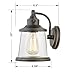 IDEAL FOR front entrance, porch, garage, patio spaces and more, this traditional outdoor downlight has a rustic oil rubbed bronze finish with a clear, ribbed glass shade