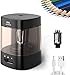AUTO STOP & SAFETY DEVICE: Portable electric pencil sharpener, auto work when insert the pencil, and auto stop at a perfect point. Another auto stop function is that the machine will stop automatically when the lid is open, protect children and kids away from hurt.