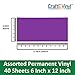 YOU WILL RECEIVE: 40 sheets of 12”x12” permanent adhesive vinyl with an easy to remove backing/liner in 20 Vibrant colors. Colors include: 2 sheets of each of these glossy colors | white, black, grey, brown, beige, metallic silver, metallic gold, blue, vivid blue, sky blue, forest green, green, lime green, yellow, red, tomato red, pink, hot pink, orange, plum and instructions for use with or without application tape.