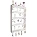 Earring Holder Measures: Extra large at 22 inches tall x 14 1/2 wide and is offset from the wall by 2 1/2 inches. 14 1/2 inches wide x 2 1/2 inches accessory tray/shelf on top, great for perfume bottles. How to Use: Attach the post back, if there is one, leaving a small space on the post. Place the back through and let it slide down into the slot. It's that easy. If there is no post back, just hang them. You can add S hooks to the bottom row of round holes to organize necklaces too.