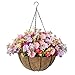 Hanging Flower Baskets:12 IN basket with silk daisy flowers,mixed bright purple and pink blooming from the coconut hanging flower basket.
