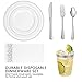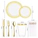 SERVE FOR 100 GUESTS: This party plates and cups set includes 100 heavy duty gold rim 10.2" dinner plates, 100 7.4" salad dessert appetizer plates, 100 plastic forks, 100 plastic spoons, 100 plastic knives, 100 count 9 oz clear plastic party cups.