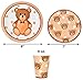 Teddy Bear Tableware Party Set Serves 24: Gift Boutique bear party set includes 24 9" dinner plates featuring a brown teddy bear with red bow tie on a white background with beige polka dots and beige border with the 24 luncheon napkins shaped as a bear face coordinating. The 24 7" dessert plates features bear faces with beige background and white polka dots and brown border and 24 9 Oz. cups coordinate.