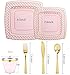 PACKAGE: 50 dinner plates and 50 salad/dessert plates & 50 cups & 50 pre rolled napkins with rose gold cutlery
