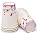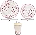 Cherry Blossom Party Set Serves 24 - Gift Boutique floral party set includes 24 9” dinner plates, 24 7” dessert plates, 24 luncheon napkins, 24 7 oz cups featuring pink cherry blossom flowers on branches on a white background with pink border.