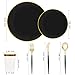 Black and gold plastic plates: the set include 25pcs of black and gold dinner plates, 25pcs salad plates, 25pcs gold knives, 25pcs gold forks, 25pcs gold spoons, 25pcs gold cups. the plates and silverware set can match to any kind of occassion