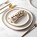 EXQUISITE DESIGN: Our beautiful dinner plates are designed with round rims accented with a fine gold mist border. The wide rims help prevent spills that may otherwise stain your tablecloth during meals. The classic design makes this a perfect product to complement any color scheme and table setting design
