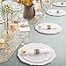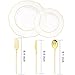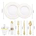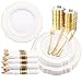 🎁【SUITABLE FOR 25 GUESTS】Liacere white and gold plastic plates include 25 heavy duty dinner plates 10.25 inches, 25 dessert appetizer plates 7.5 inches, 25 gold rimmed champagne flutes plastic 6oz, 25 thick napkins and 25 gold plastic silverware sets.