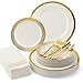 A STUNNINGLY STYLISH SETTING: Start using fancy disposable dinnerware set that your guests can't help but talk about. These heavyweight plastic plates for party feature stylish black embellishments which match the gold plastic silverware for a truly premium presentation.