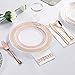 「Elegant Rose Gold Design」 The plastic rose gold plates adopt simple and elegant design. The dinnerware with rose gold silverware make your event more elegant and luxurious. Pink creates a warm and romantic atmosphere.