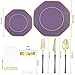 ⩺【HEALTH & DURABLE】: Our purple plastic plates and disposable gold plastic cutlery are safe for you and your guests! 100% food grade, non-toxic, BPA-free plastic! Those gold plastic plates and gold silverware are solid, durable and won't scratch or break easily.