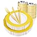 HIGH QUALITY: Our yellow plastic plates,gold plastic silverware with yellow handle and clear plastic cups are made of 100% food-grade,BPA-free,high gloss rigid plastic. These are no blemishes and look like real China.