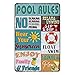 Pool Rules Sign - Perfect decor for swimming pools! Add a splash of wall art pool decor to your swimming area this season.Funny pool rules signs.Metal sign dimensions are 12x8 Inch