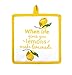 Contents: Set of 4 decorative potholders, Lemon When Life Gives You Lemons Make Lemonade. Print on one side and solid color on the reverse side. 2 pairs. 1 free aluminum bottle opener shipped in random color.