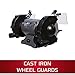 SAFETY: Cast iron wheel guards and dust ports, and adjustable eye shields and spark guards.