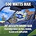 500 WATTS PEAK OUTPUT – amplifier powers 8 marine grade speakers (2 tweeters, 4 midrange, 2 woofers) with optimized bass performance; ECOCAST compatible – pair up to 50 units together; Built-in waterproof AUX-OUT jack to daisy chain to other optional wired speakers or powered subwoofer (sold separately)