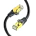 【Stability & Durability】Composed of 4 pairs Stranded Bare Copper Conductors; SSTP (Screened Shielded Twisted Pair) Shielding provides the best protection against electromagnetic interference and radio-frequency interference (EMI/RFI), and eliminates alien crosstalk (AXT); The Shielded Rj45 connectors with 50 micron Gold-Plated contacts, molded strain-relief boots, and snagless molds provide durability and ensure a secure connection.