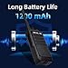 1200mAh rechargeable Li-ion battery lasted over 10 hours and no problems; you can charge it the night before; and in use from 6:30am until 11pm and never any of them need re-charging; power saving function extends battery performance; low battery alarm reminds you to charge in time