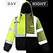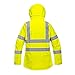 SAFETY BOMBER JACKET - Premium high vis jacket featuring: (1) clear ID pocket, (2) front pockets & (1) chest pocket large enough to hold phone/tools, (1) arm pocket, (1) interior pocket, (1) foldable hideaway hood & (1) heavy duty zipper closure to keep you warm day/night. This men's work jacket keeps you dry by withstanding light rain, wind & other weather. Insulated reflective jacket men includes adjustable elastic wrist cuffs allowing you to keep in warmth & move freely w/ a comfortable fit.