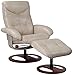 Chair swivels a full 360 degrees and reclines 45 degrees. Taupe bonded leather. Solid wood walnut finish base.