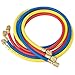 THREE-WAY HOSES: Includes a 3pc, 5-foot freon charging hose with 3 colors for easy recognition, red for high pressure, blue for low pressure, and yellow for the refrigerant bottle.
