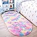 Unique Style Rainbow Rug: The soft kids rugs for bedroom girls showcases a beautiful and bold color design. The fluffy rug surface is covered with 1.7" velvet faux plush high pile for warmth and beauty. The shag rug bright colors and plush appearance are perfect for a child's room. Let your kids and pets have fun on the cold floor!