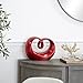 RED GLOSSY FINISH: Metallic red sculpture with black textural markings over the round, swirling, abstract body, similar to a ribbon