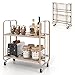 〖Multi-Partition Storage Space〗: 3-tier bar serving cart with a roomy top tray and 2 open shelves of different heights helps to orderly store your utensil. Built-in wine glass holders and 3-tier wine rack facilitate storage, making wine glasses easily accessible. The mobile cart accommodating all your food and drinks will come in handy in a chaotic kitchen.