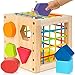 【ENGAGING SHAPE SORTER】The wooden shape sorter cube toys contain 8 diverse shapes in different colors and a sturdy box with colored rubber bands and shape holes on both sides, where kids can push the shapes in through the soft and elastic rubber bands or corresponding holes. Great toys to provide hands-on, screen-free fun for your baby.