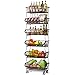 【 Large Storage Capacity Stackable Storage Basket 】 5-Tier wire storage baskets shelves Size: 16.14" L x 11.42"W x 39.76"H. Dimension of single large basket is 16.14"L x11.4"W x 4"H, dimension of the top basket is 16.14"L x11.4"W x3.5"H. This rolling storage basket with 8" apart in each wire basket height, enough space to store your fruits and vegetables, potatoes and onions, snacks, ect., keep your kitchen counter neat.
