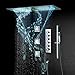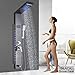 Luxury shower panel has built-in LED temperature display, LED overhead rainfall showerhead, adjustable high-powered body massage jets, tub spout, and high-efficiency multi-function handheld shower wand