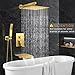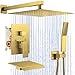 ✔Gold Shower Faucet Set: 12 inch square rain shower head (Brass), rainfall shower head with handheld (Brass), Tub Spout faucet(304 stainless steel),15.7 inch shower arm (stainless steel), 59 inch shower hose (stainless steel), handheld shower holder (stainless steel), shower valve (Brass) and trim kit included.