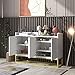 【Sturdy Storage Sideboard】- The frame of this sideboard is manufactured of particleboard with melamine stickers, Four legs of gold metal plus a support leg in the centre, all legs have plastic pads at the bottom to prevent scratching the floor. That design ensures that this sideboard is more stable and can support a certain amount of weight. Weight Capacity: Tabletop-100 LBS, Open shelf and cabinet-66 LBS.