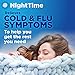 NIGHTTIME COLD AND FLU MEDICINE provides multi-symptom relief of headache, fever, sore throat, sneezing, runny nose, cough, and minor aches and pains