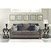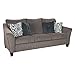SOFT NEUTRAL: Dressed up in a soothing pewter hue, this sofa serves as a cornerstone of style in your living room space. Throw pillows with feminine scroll and plaid patterns add a chic touch