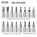 Impcat Bits:Tough bit design so the screw driving bits are impact rated and provide 10X longer bit life than standard impact bits. They are made of durable, wear-resistant S2 steel with a black finish for rugged, reliable strength. 4 x Torx (T15, T20, T25, T30), 4x Phillips ( PH1, PH2, PH3), 3 x Pozidriv(PZ3, PZ2, PZ1)