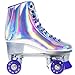 💜 RETRO QUAD SKATE — The classic double-row roller skates will always be around to pay homage to roller skating roots. The 1-inch heels and timeless retro design will keep you looking great as you skate. Classic double-row roller derby skates are safer and more stable than inline roller blades, ideal for beginners and women or men who want to easily learn roller skating. Holographic silver with purple is a super cool color.