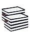 DESIGN SPECIFICATIONS — Decorative storage boxes feature wooden crate inspired pattern in rustic gray color — Soft fabric storage bins made of non-woven polyester with cotton rope — Carry handles and Velcro lid closure — Cardboard base insert keeps each bin in place — Wipe clean — Measures approximately 16.62” L x 8” H x 12.25” W