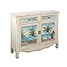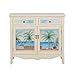 Medium Size; Tropical Motif; Scalloped Apron; 1 Interior Shelf; Product Dimensions 40"W x 12"D x 35.5"H; Frame Color Cream; Design Cupboard; Shape Rectangle; Material Breakdown MDF 95%; Wood 5%; Top Thickness .98"; Apron Height/ Footrest Height 3.25"; Feet/Leg Height 5.31"; Total Weight Capacity 80 LBS; Drawers Included (Yes/No) Yes; Number of Drawers 2; Interior drawer Dimensions 12.52?W x 8.19?D x 3.07?H; Drawer Glide Material Wood; Extended Drawer Glides (Yes/No) No; Number of Doors 2; Fixed