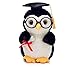 Black and white owl wearing round glasses, a black graduation cap and holding a diploma.