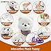 【MORE FUNCTIONS】: Differ from another two styles, this plush puppy can bring more fun. The feeder in the package is also a funny prop. If you put the feeder near puppy’s mouth, it will walking to you and barking, as if asking for food. What interesting features! All the interactive functions are to provide fun for children. Tap her on the back and she'll snore, as if you're lulling her to sleep.