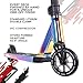 SUITABLE FOR ROUGH KIDS! The pro scooters can ride hard that have equipped with custom components! Solid 110mm Alloy Neo chrome Wheels, Noise-free Brakes, Tough T-6061 Aluminum Deck, High Rebound 88A PU Wheels and One-Piece T4T6 Fork. That you can do whatever tricks you like such Barspin,Tailwhip,Double Backflip, ride it hard just like the pros!
