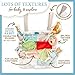 SENSORY DETAILS: This activity blanket features multiple textures, peek-a-boo pockets, crinkle sounds, plush characters, BPA free teether, and Velcro straps for on the go fun.