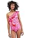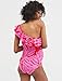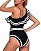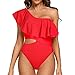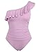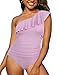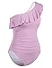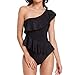 Off the shoulder one piece swimsuit features ruffle trim; Asymmetric one shoulder neckline