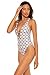 PRODUCT DESCRIPTION: Skylar one piece swimsuit features a textured rib fabrication with a medallion print that reverses to solid mist, removable halter cups and a plunging neckline with a center tab. Offers loop crisscross back ties and moderate bottom coverage.