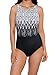 Engineered print and side shirring create an hourglass waist. Scoop back. Moderate cut leg elongates the look of legs.