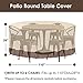 Size: 110"DIAx28"H. Fits 96,110 inches diam round patio tables or fits including but not limited to 48,52,54,55,60,62,64,68,70,72,76,84,96 inches table chairs set.Note: The coverage depends on the size of the furniture set, especially the depth of the chairs. Please measure the dimensions of your furniture carefully before purchasing.