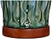 Handmade ceramic construction. Hand-applied blue teal glaze. Cherry wood finish accents. Linen fabric drum shade. 7-foot long cord.