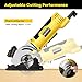 【POWERFUL MOTOR AND COMPACT SAW】580W/4.8Amp powerful motor provides 4000RPM no-load speed for cutting wood, metal, tile, aluminum plastics, and PVC tubes with ease. 3 Blades: 1x24T TCT(85mm) for woodcuts, 1x44T HSS(85mm) for wood and soft-metal cuts, and 1 grit diamond blade(85mm) for tile cuts, extending the applications of the compact circular saw. Great circular saw for home improvement and the perfect gift for woodworking and DIY lovers.